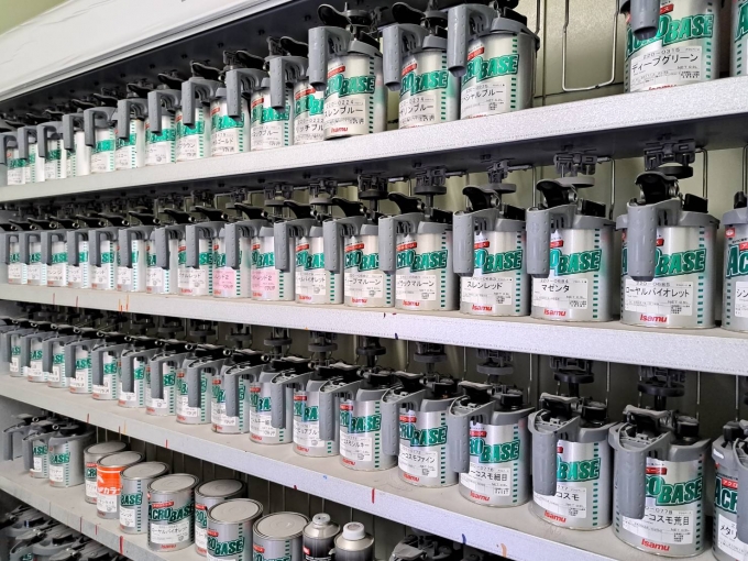 鈑金・車の修理工場では、 最新の設備と最高級のイサム製塗料を使用し、国産車から高級外車まで